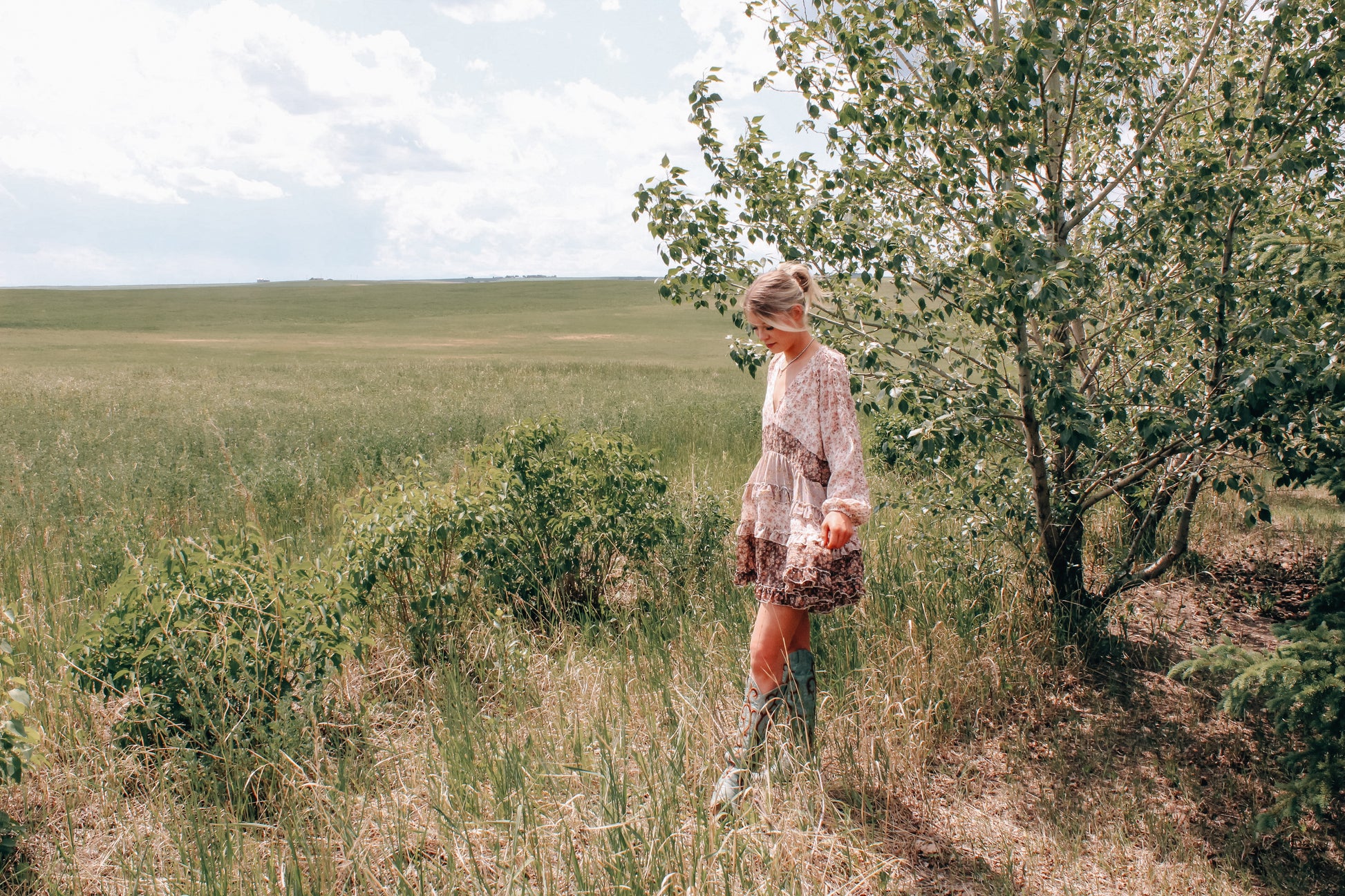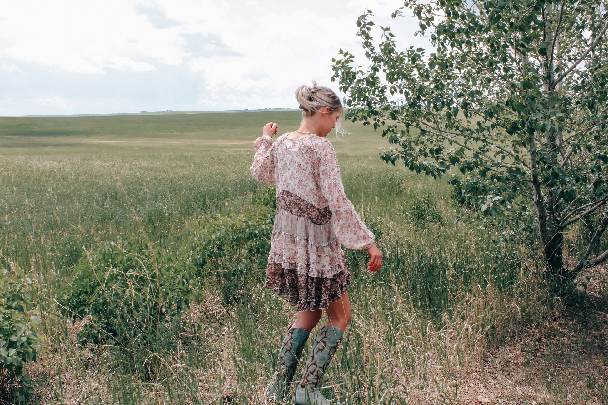 Romance meets rustic in the Amelia Mini Dress - a dreamy blend of soft florals, vintage ruffles, and prairie charm. This lightweight dress features delicate long sleeves, a plunging V-neckline, and a smocked waist that flatters every figure. The tiered skirt adds texture with layers of soft blush and earthy brown floral prints, finished with subtle ruffle trim throughout.